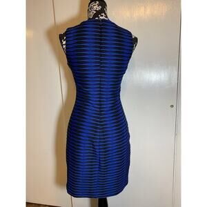 This Calvin Klein dress is a knee-length, sleeveless fit & flare style in a blue striped pattern. Made of polyester and spandex, it features a zip closure and offers a stretch for a comfortable fit. The hourglass shape is designed for a curvy size M, perfect for parties, casual wear, weddings, and outdoor events in the summer, fall, and spring seasons.