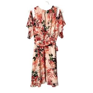 Calvin Klein Dress Size 10 Spring Floral Cold Shoulder Belt Chiffon Knee Length short sleeves lace tie on waist orange red elastic waist no size tag size medium based on size chart and measurements pre owned in great condition please see pictures for more details and measurements