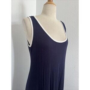 This Calvin Klein dress is a stylish navy blue maxi dress in size 10 for women. It features a scoop neckline, sleeveless design, and a pullover closure for easy wear. Made of a comfortable rayon and spandex blend with stretch, this bodycon tank dress is suitable for various occasions such as travel, parties, work, or casual wear. The dress has a logo accent and falls to a long length, making it perfect for summer, fall, or spring seasons with a versatile style that can be worn for beach outings, city adventures, or classic and retro looks.