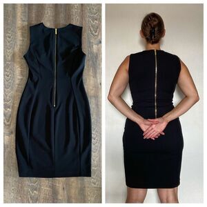 The perfect little black dress from Calvin Klein. Classic silhouette with flattering lines for a polished vibe that never goes out of style. Keep it clean and minimal with neutral pumps or add bold statement jewelry or a bright cardigan to amp up your style. Women’s size 6. Golden back zipper hardware. Please see photo section for approximate flat measurements + my model stats for fit reference. Note: there is no garment tag. It is a synthetic blend with some stretch.