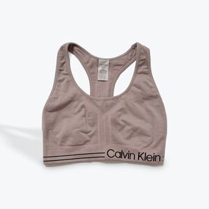Calvin Klein sports bra bralette in dusty pink, size XS. Features a racerback style with a stretchy, seamless fit and signature Calvin Klein logo band under the bust. Comfortable and supportive for everyday wear, lounging, or light workouts. Excellent pre-owned condition.