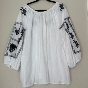 Calvin Klein Embroidered Boho Cottage Peasant Top, White/Black Cotton, size 2X