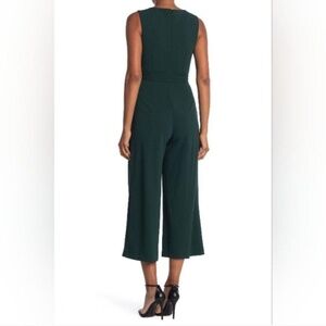 Calvin Klein emerald green sparkly belted wide leg jumpsuit. Front V neck with belted waist. Back has a high back with pleats at the waist. The pants are wide legged and slightly cropped - see measurements below. The jumpsuit is lined so the glitter material is not scratchy against the skin. New with tags. Smoke free home.