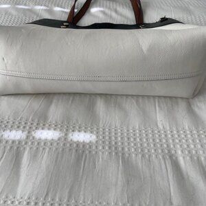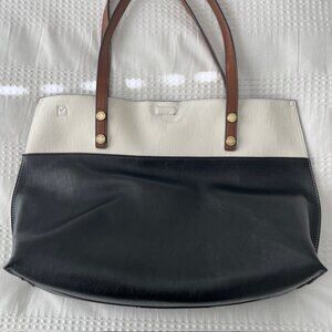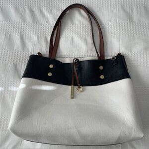 Calvin Klein Tote bag is faux leather with pebbled detail and is in excellent condition. Tote bag has short handles to carry and a long detachable handle for shoulder or crossbody carry. Bag is reversible for black bottom/white top or white bottom/black top with brown straps. Strong magnetic closure. Gold detail Logo bar and circle and gold buttons. Tote is about 20" X 13" X 5"