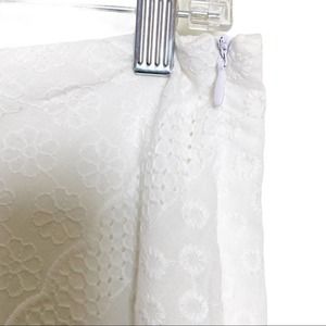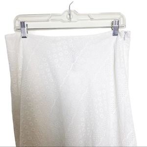 Calvin Klein Eyelet Split Hem Wear To Work Skirt. A-line silhouette. Eyelet and floral embroidery detail allover. Open front split. Lined. Hidden side zip closure. 100% cotton.