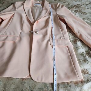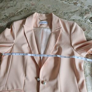 Brand new with tags. Elegant Calvin Klein open front blazer in soft peach with faux pearl button accents. Fully lined, tailored fit, perfect for work, special events, or casual chic styling. Womens size 14. Original retail tags attached.