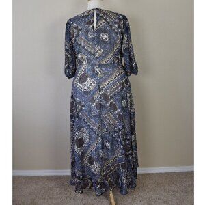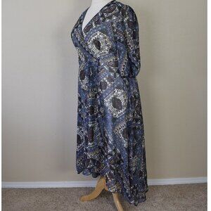 Calvin Klein faux wrap high low dress. Size 16. NEW without tags, spare button envelope attached inside hem. Crinkle chiffon material. 3/4 sleeve. V-neck. Back zipper with button behind neck. Back keyhole opening. Fully lined.