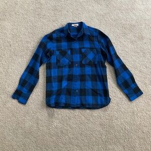 Blue and black Calvin Klein flannel. 85% acrylic and 15% wool.