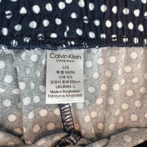 Calvin Klein flannel pajama bottoms. Cute navy & white polka dot pj bottoms. Pair with your favorite sleep shirt! Elastic waist with adjustable tie. Comfy. Great condition with one small blemish on one leg - seems to be some sort of residue (see last photo).