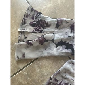 Elegant Calvin Klein blouse with floral design. Features purple and white hues. 23” pit to pit wth x 29” lth.