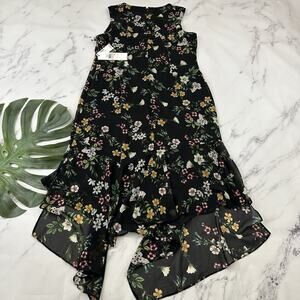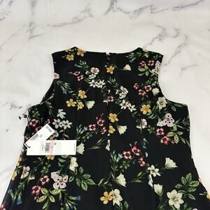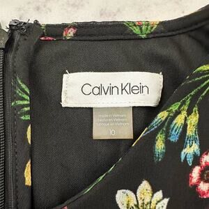 Calvin Klein women's black and green floral flutter hem shift dress, size 10. It is new with tags and is free from any rips or stains. It measures about 41 inches around the bust, about 38 inches around the waist and is about 45 inches long.