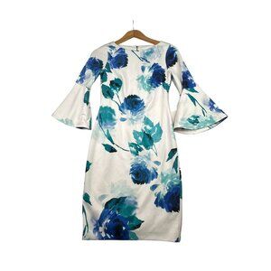 Calvin Klein Floral Print Bell Sleeve Knee Length Dress size 2 White/Blue