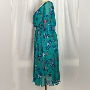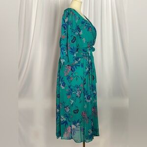 This Calvin Klein sundress features shades of teal, blue, pink and white. It has a V neckline, long sleeves, and a self-tie belt at the waist, creating a fit and flare silhouette. The dress has a pleated skirt. Back zipper closure.
