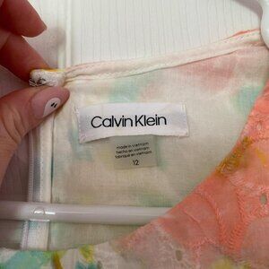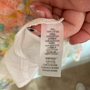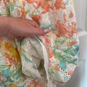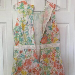 Floral dress with lace trim, perfect for any occasion dressed up or down. Hits about lower/mid thigh on 5’8” woman. Model is dress size 10-12, C-cup bust.