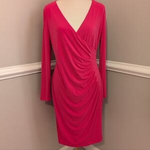 Chic long sleeve dress with a beautiful fuchsia pink color. Really nice stretchy fabric that makes it super comfortable to wear. Gathered at the waist for nice detail. Fabric is lightweight enough for transitioning between seasons. Size 12.