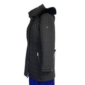 Calvin Klein Fur Trimmed Diamond Quilted 3/4 Length Coat - Black, Size Large