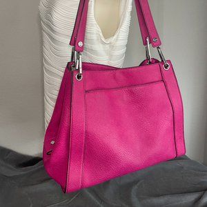 Calvin Klein Fuschia Shoulder Bag, two straps with silver findings, exterior snap pocket, two main sections, center zipper section, interior side pocket, 2 interior open pockets.