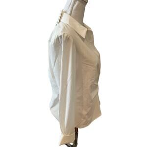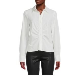 New Calvin Klein Gathered Button Down Collared Shirt White, size L. Elegant, workwear shirt designed solid with soft gathers on the placket. This stretchy cotton blend top is Perfect for the office this fall