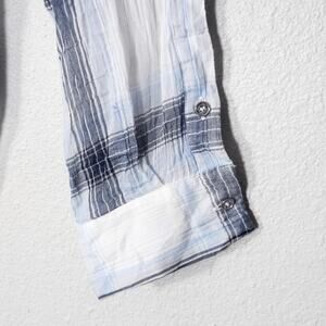 This Calvin Klein shirt dress is made from lightweight gauzy cotton with a soft blue and white plaid that feels airy, easy, and effortless. It has a relaxed longline silhouette with a button front, collared neckline, and roll tab sleeves, making it a versatile piece that works as a dress or as a light layer. The fabric has that breathable lived in texture that reads casual and wearable rather than structured or tailored.