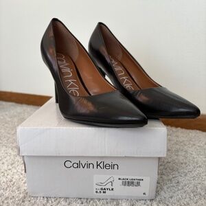 Black Leather Calvin Klein Gay Pumps. Size 6.5 M. Hardly worn. In excellent condition. Silver name plate on heel cup of shoe.