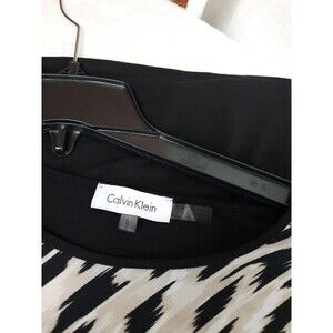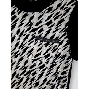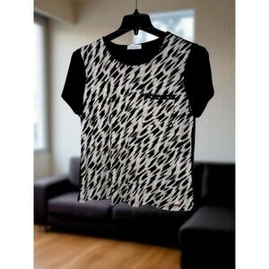 The Calvin Klein Geometric Animal Print Short Sleeve Top is a stylish and versatile addition to any woman's wardrobe. Made from comfortable and breathable rayon fabric, this pullover blouse features a round neckline, black back and sleeves and a breast pocket with faux leather trim and studs. The geometric animal print adds a fun and trendy touch, while the gold logo plate adds a touch of luxury. Suitable for various occasions, including parties, casual outings, and business meetings, this top is easy to care for and perfect for the summer and spring seasons. Upgrade your wardrobe with this designer piece from Calvin Klein.