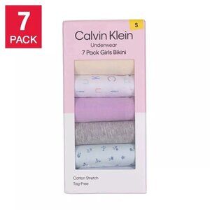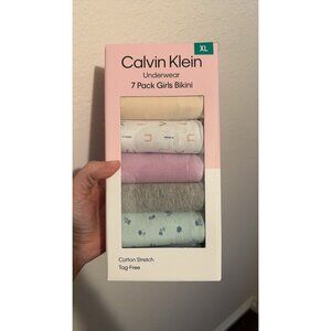 The product is a set of seven Calvin Klein girls' underwear in size XL, featuring a bikini style and made from a comfortable cotton blend material with added stretch for flexibility. The underwear is tag-free for a more comfortable feel, making it ideal for everyday wear. The multicolor design adds a fun and vibrant touch to these essential items, perfect for active young girls looking for style and comfort in their underwear collection.