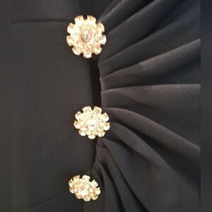 Elegant gown in faux-wrap style styled with ruching and tulip hem.