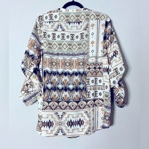 This Calvin Klein blouse showcases a relaxed fit with a captivating graphic design in earthy brown and green hues. The mandarin collar adds sophistication, while the button-down style offers versatility for various occasions. Perfect for those seeking a unique and stylish addition to their wardrobe.