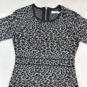 Elevate your wardrobe with this stunning Calvin Klein gray sweater dress featuring a mix of animal prints. The short-sleeved dress has a round neckline with a zip closure in the back, making it perfect for workwear, party/cocktail events, or casual outings.