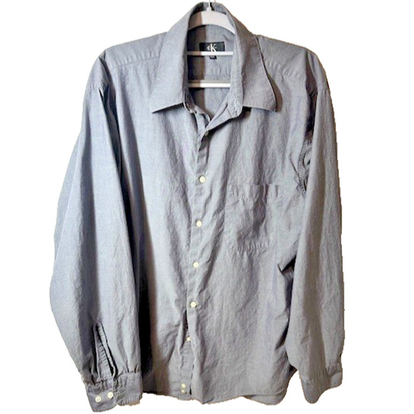 Calvin Klein men’s gray long sleeve button-down shirt in a classic casual style.