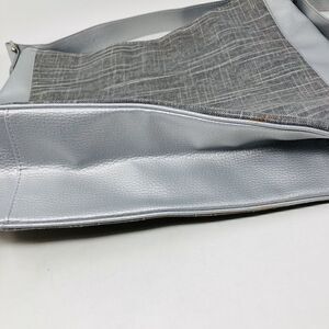 Crafted from durable canvas material, the exterior of the bag is a chic gray color and features a snap closure. The bag also comes with a faux leather handle/strap in a matching gray color, with a drop of 15 inches for comfortable carrying.