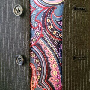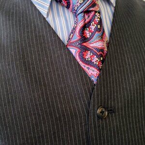 Calvin Klein made in Canada, where their nicer collections are made. This modern 3 button 3 piece suit is made of 98% wool 2% XLA. This suit is made for the active guy who likes luxurious feeling garments.