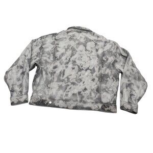 The cotton tie-dye gun metal trucker denim jacket features a single chest pocket, 2 hand pockets, an inside pocket, a boxy shape, a collar and silver hardware. Soft denim, excellent condition. Calvin Klein sample. Size medium, oversized.
