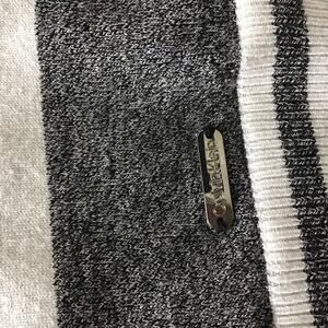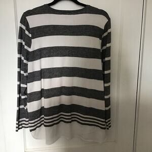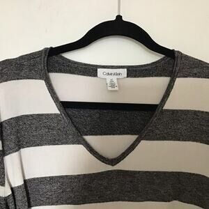 Calvin Klein Gray & White Stripe Lightweight Layered Look v-neck Sweater. It has a nice little metal tag That says Calvin Klein.
