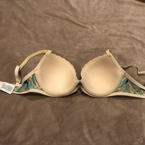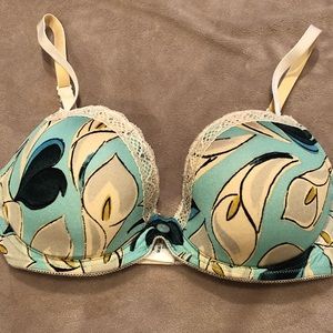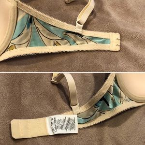 EUC. Beautiful pale green satin with creamy floral print. Cream straps, lace trim, and button detail on front. Lightly lined style with underwire. No rips, snags, and elastic on hook closure/straps is not showing signs of wear.