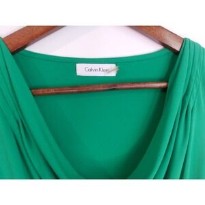 Emerald elegance defines this Calvin Klein dress, a vibrant statement piece for the modern woman. The dress features a flattering V-neckline with subtle pleating that adds texture and sophistication. Its sheath silhouette gracefully contours the body, making it ideal for both professional settings and evening events. Imagine the confidence you'll exude as you walk into a business meeting or a cocktail party wearing this stunning green dress. Perfect for a garden party, a business conference, or a sophisticated dinner date.