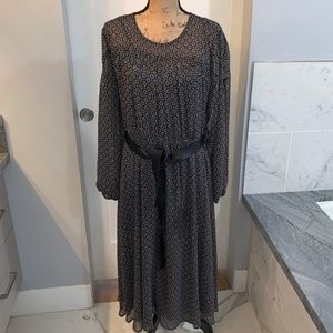 Green metallic thread printed semi sheer , sheer sleeve , layered midi length dress from Calvin Klein.