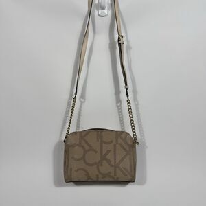 The Calvin Klein Hayden Monogram Top Zip Chain Shoulder Bag is a stylish and practical accessory for women. Made from faux leather with a matte finish, this medium-sized rectangular bag features a tan shoulder strap and gold hardware accents. It is perfect for casual occasions and includes features such as credit card slots, a cross-body strap, inner dividers, and a mobile phone pocket. The beige exterior and monogram pattern add a touch of classic yet modern flair to the Calvin Klein collection. Perfect for everyday use, this shoulder bag combines fashion and functionality.