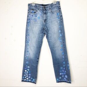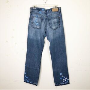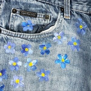 Calvin Klein, 100% cotton, handpainted floral, vintage mum jeans, hand painted flowers are also on the back pocket and down the back legs, with acrylic artist paint, and sealed, then washed and dried on high heat, jeans and flowers will distress organically, no damage very good condition very size 32