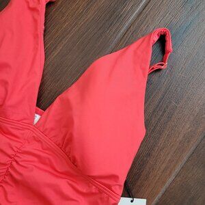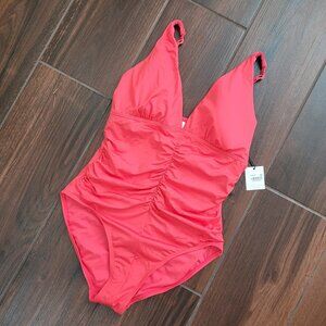 Calvin Klein Bright Pink One Piece Ruching Triangle Women's Swimsuit brand new with tags. Has removable cup pads and adjustable straps. Extremely flattering silhouette. Lots of stretch. Color is like a bright watermelon pink.