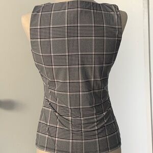 Calvin Klein black and light pink and white houndstooth inspired sleeveless blouse. Scoop neckline. Polyester blend fabric. Lightly worn, in excellent condition.