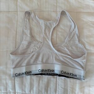Medium, used, but no noticeable flaws, stretchy, sports bra, super soft, cotton modal stretch, no padding, racerback, calvin klein logo band