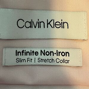 Calvin Klein Infinite Non-Iron Slim Fit Dress Shirt in Light Pink. It features a comfort stretch collar. Don't sacrifice comfort for style with this slim-fitting dress shirt. Classic Fit - Cut with ease in the shoulder and chest and is fitted through the body.