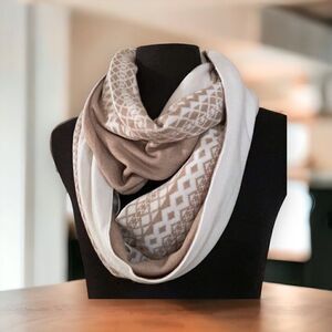 Tan and cream patterned infinity loop scarf by Calvin Klein