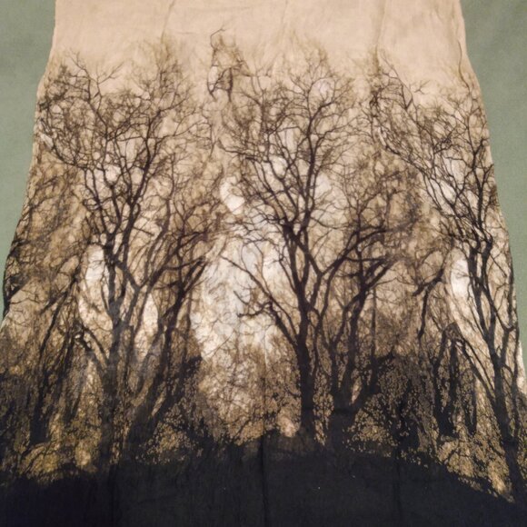 Lightweight infinity scarf with tree design. Add to your outfit or hang as a tapestry. Approximately 30 inches wide and 40 inches tall when laid flat. A few small pulls in the fabric.
