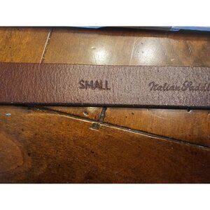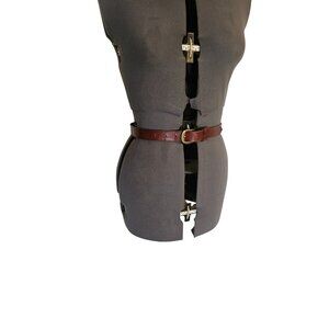 This finely crafted Italian saddle leather belt tells a story of timeless sophistication and durability. Designed by Calvin Klein, its classic brown tone and brass buckle evoke a sense of understated elegance, while its compact size offers a perfect fit for smaller waists. A vintage piece of wearable art. Pre Loved