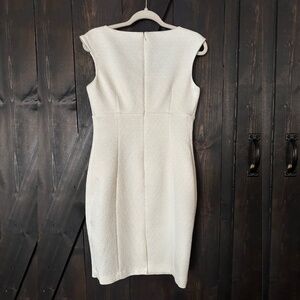 A timeless Calvin Klein sheath dress in a soft ivory textured fabric that feels instantly polished. With its structured square neckline, elegant pleating, and flattering tailored fit, this piece is perfect for work, special events, or any moment you want a clean, classic, effortlessly sophisticated look.