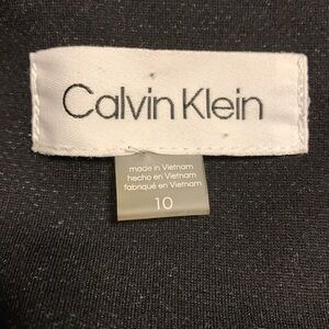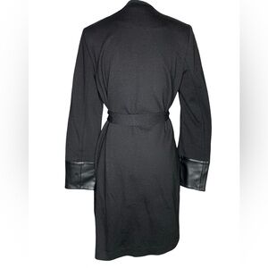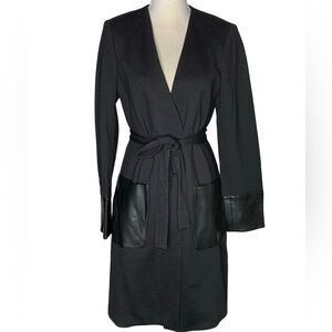 Calvin Klein Belted Jacket With Faux Leather Pockets And Cuffs. Shoulder pads. Tie belt closure. Excellent used condition. Size 10. Armpit to Armpit 19 inches. Shoulder to Hem 38 inches.