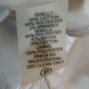 This is a women’s Calvin Klein sheath dress in size 6. The dress is sleeveless and features a beige jacquard textured fabric with a subtle leaf-like pattern that gives it an elegant and modern look. It has gold-tone logo bar accents at the waist that create a flattering silhouette. The dress is fully lined for comfort and has a back zipper closure with a hook-and-eye at the neckline. Made from a blend of cotton, polyester, rayon, and spandex, it offers both structure and a touch of stretch. Perfect for work, business events, or special occasions, this dress combines timeless style with sophisticated details. It is pre-owned and in good condition, showing only light normal wear. Please review photos for details.