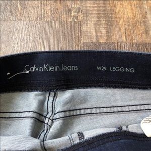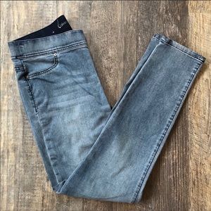 Gently worn. Elastic waist, pull on Calvin Klein skinny jeans. Light Wash, back pockets, and 28 inch inseam. No holes or staining!